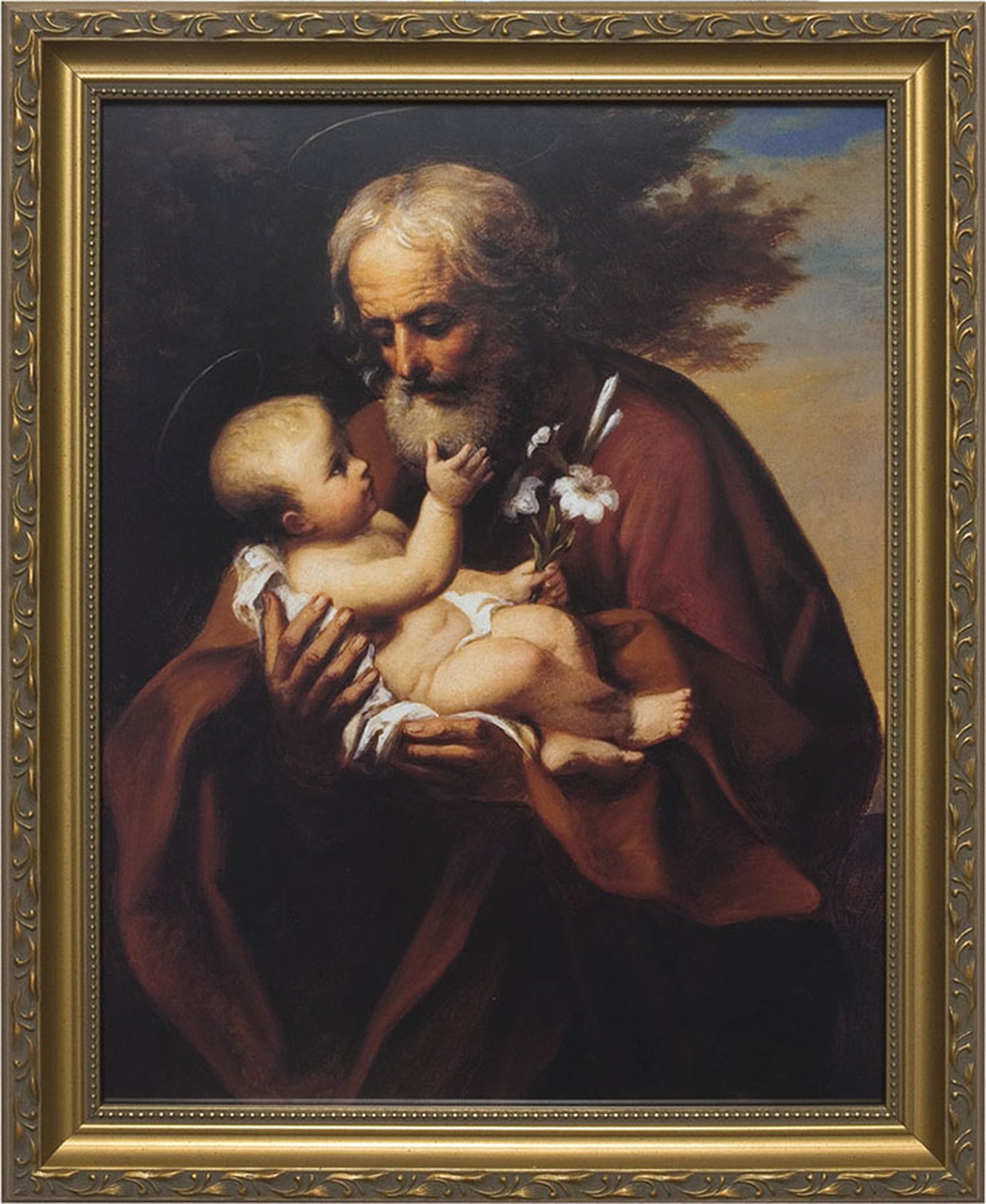 This loving and tender depiction of St. Joseph as an old man with the Child Jesus is by the Italian High Baroque artist Guido Reni. Our image comes as fine art print under premium clear glass and solid wood frames.