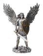 This handsome statue of Saint Michael measures 13.5 inches tall. Features the angelic Saint with armor, shield and sword in a bright pewter finish with gold details.Saint Michael the Archangel is the patron saint of police, emergency medical technicians, and the military (especially Airborne Paratroopers). He is the defender against evil and the Evil One.