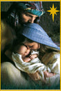 A tender, almost photographic, image of St. Joseph holding both Our Blessed Mother and the Newborn King, as Mary kisses and cradles the baby Jesus.