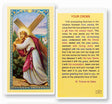 Durable laminated holy prayer card that contains a color image of Jesus Christ carrying His Cross on the front, and a prayer by Saint Francis de Sales on the back.